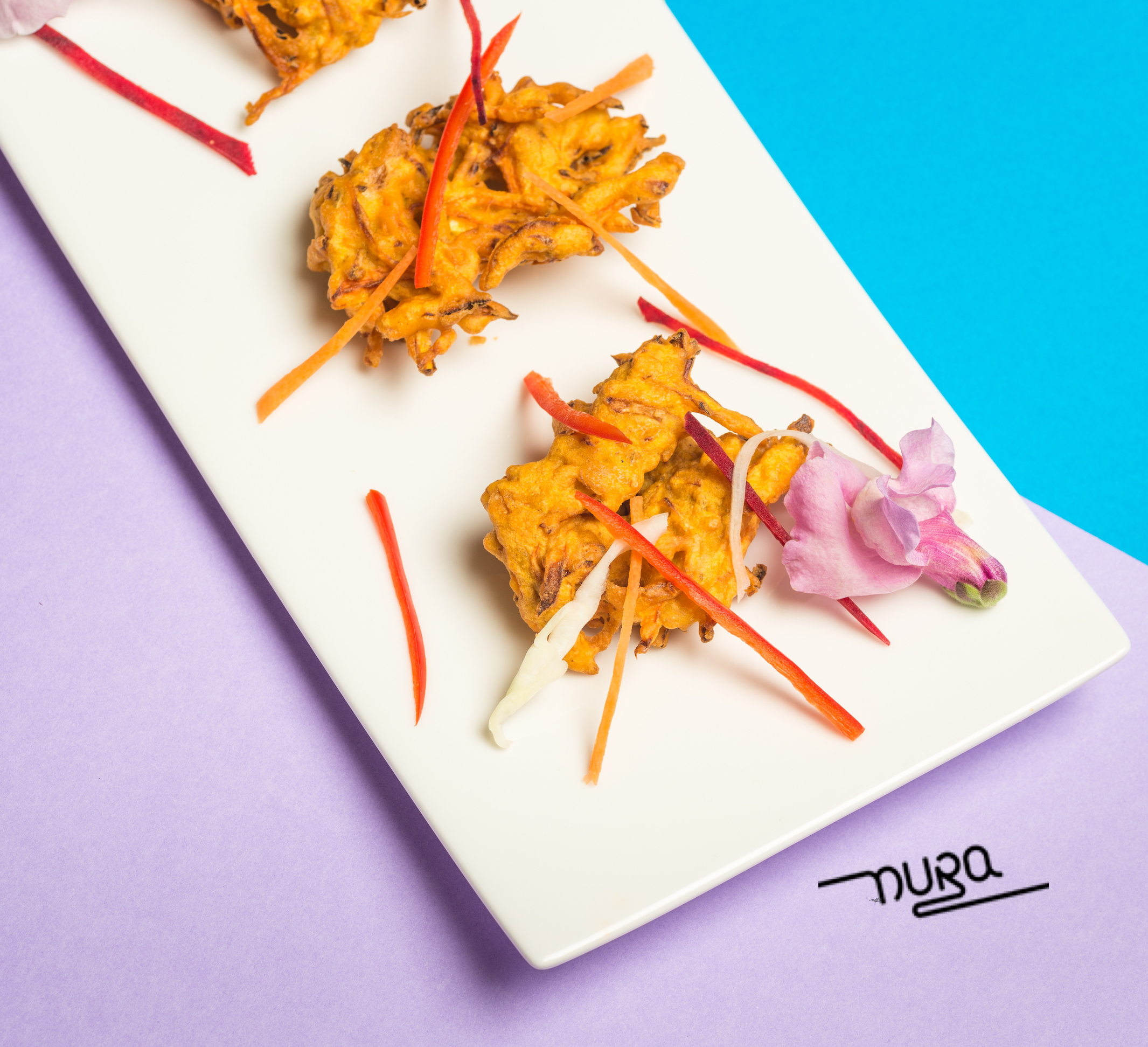 CROCCANTI FRITTELLINE DI CAVOLO CAPPUCCIO, CAROTE E CIPOLLINE IN UNA FRAGRANTE PANATURA CON FARINA DI CECI DELICAMENTE SPEZIATE con una GUSTOSA SALSA AL TAMARINDO come accompagnamento (4 frittelle per ogni porzione).